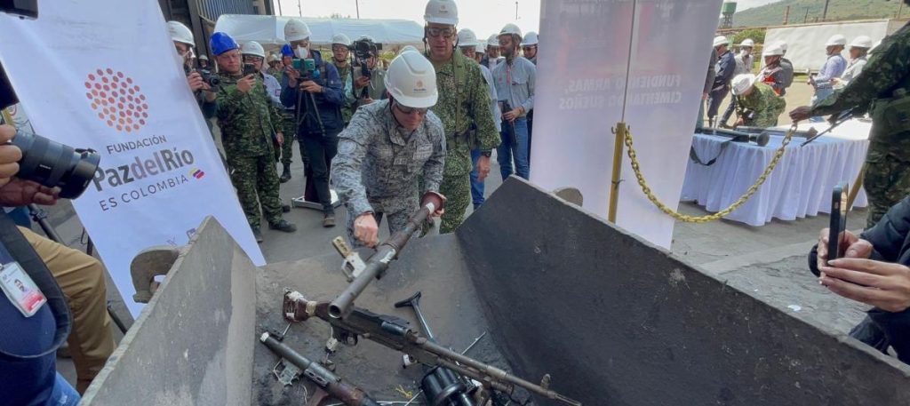 “Son cerca de 43 toneladas que, en un proceso de economía circular, van a adquirir un segundo uso: acero de refuerzo para construir vías, puentes y hospitales, en colaboración con los grupos de ingenieros militares (…) Es como un acto de perdón y olvido, ¿sí? Simbólicamente, representa que este acero vuelve a su condición natural,” señaló Fabio Hernando Galán, presidente de Acerías Paz del Río.
