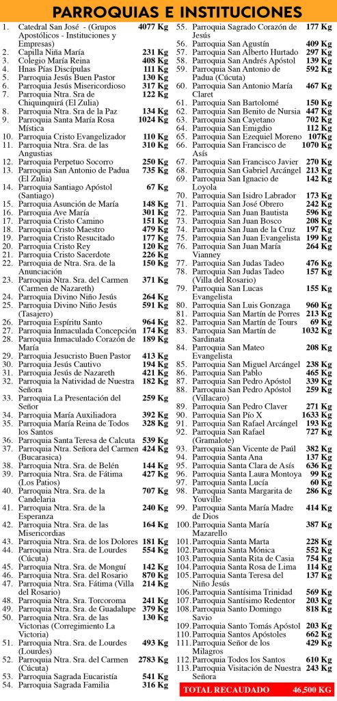 A continuación, el informe detallado por parroquias e instituciones de lo recaudado.