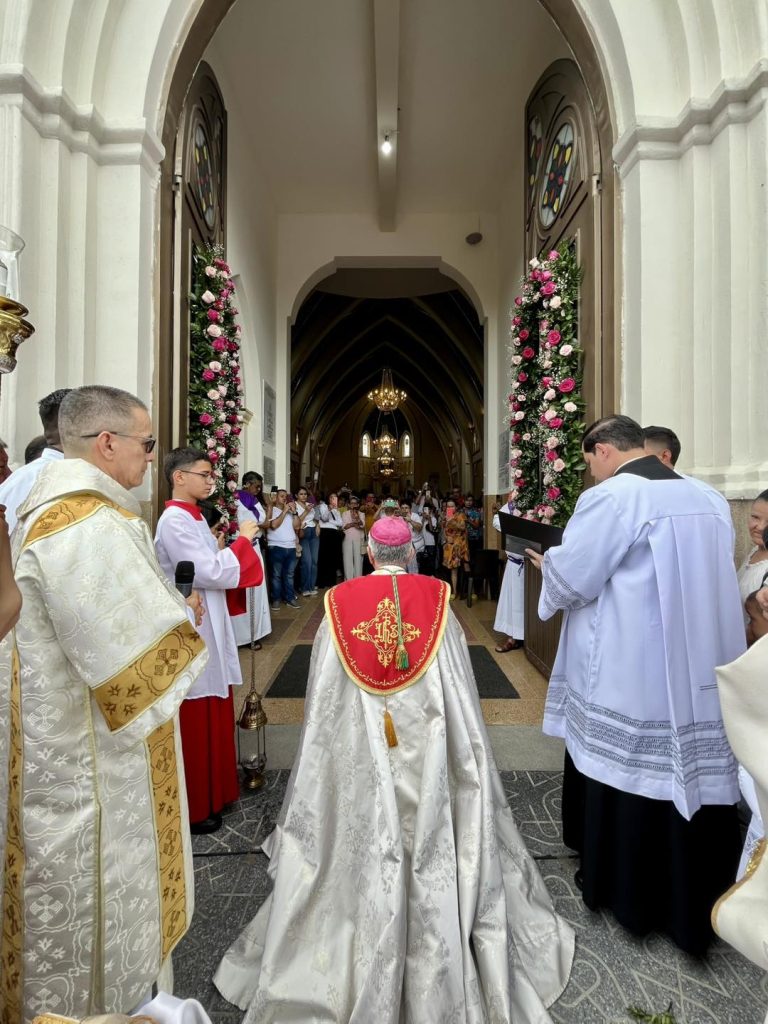 Con gran devoción y masiva asistencia de fieles, el pasado domingo 13 de julio, se dio inicio al Jubileo Mariano de esta Iglesia Particular, con la apertura de la Puerta Santa en la Basílica Menor de Nuestra Señora del Rosario de Chiquinquirá, Kacika de Cúcuta. La celebración fue presidida por Monseñor José Libardo Garcés Monsalve, obispo de la Diócesis de Cúcuta, en compañía del párroco y rector de la Basílica, el Pbro. José Elver Rojas Herrera, el vicario parroquial Pbro. Fabio Enrique Durán, algunos miembros del clero diocesano, seminaristas del Seminario Mayor y la comunidad en general.