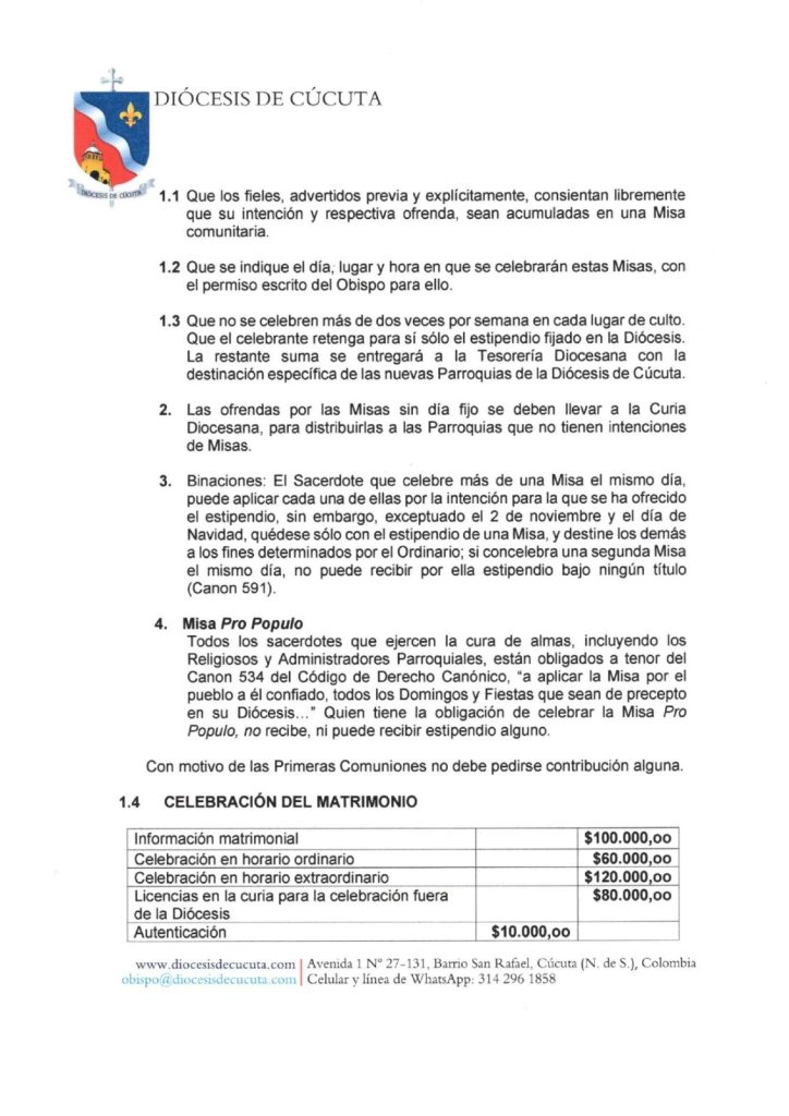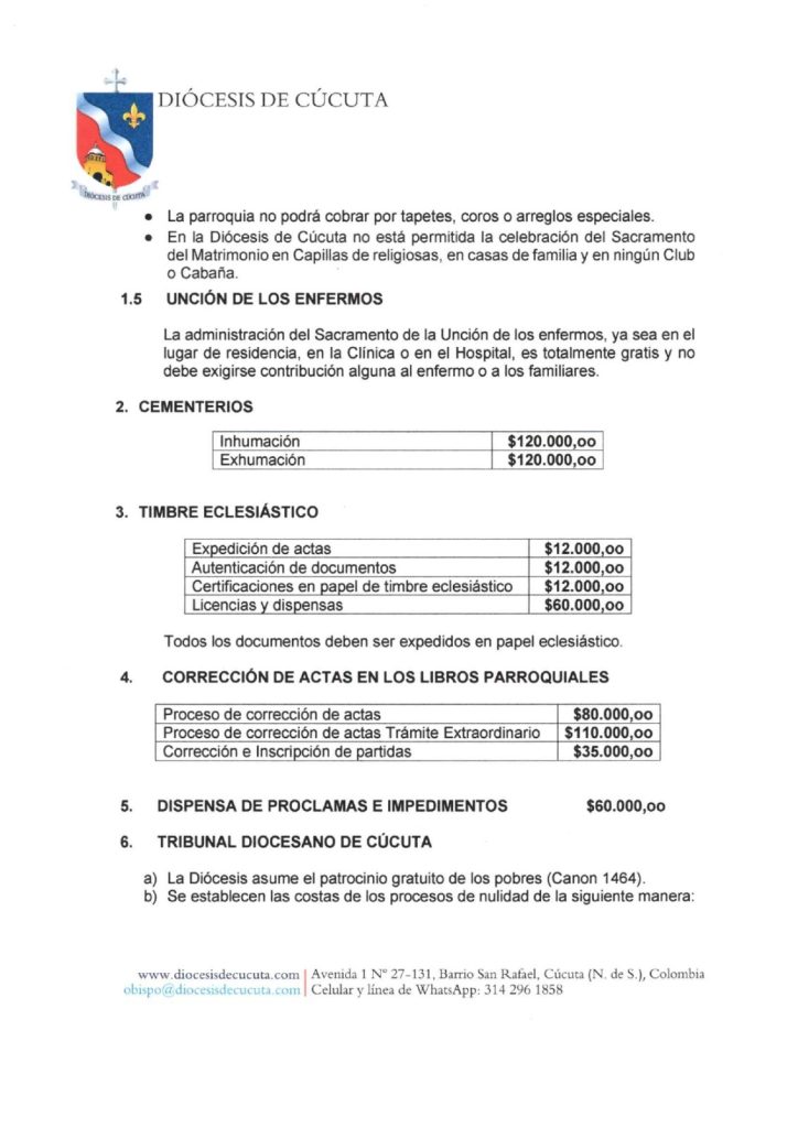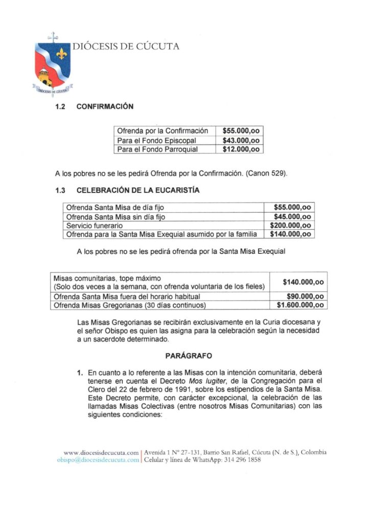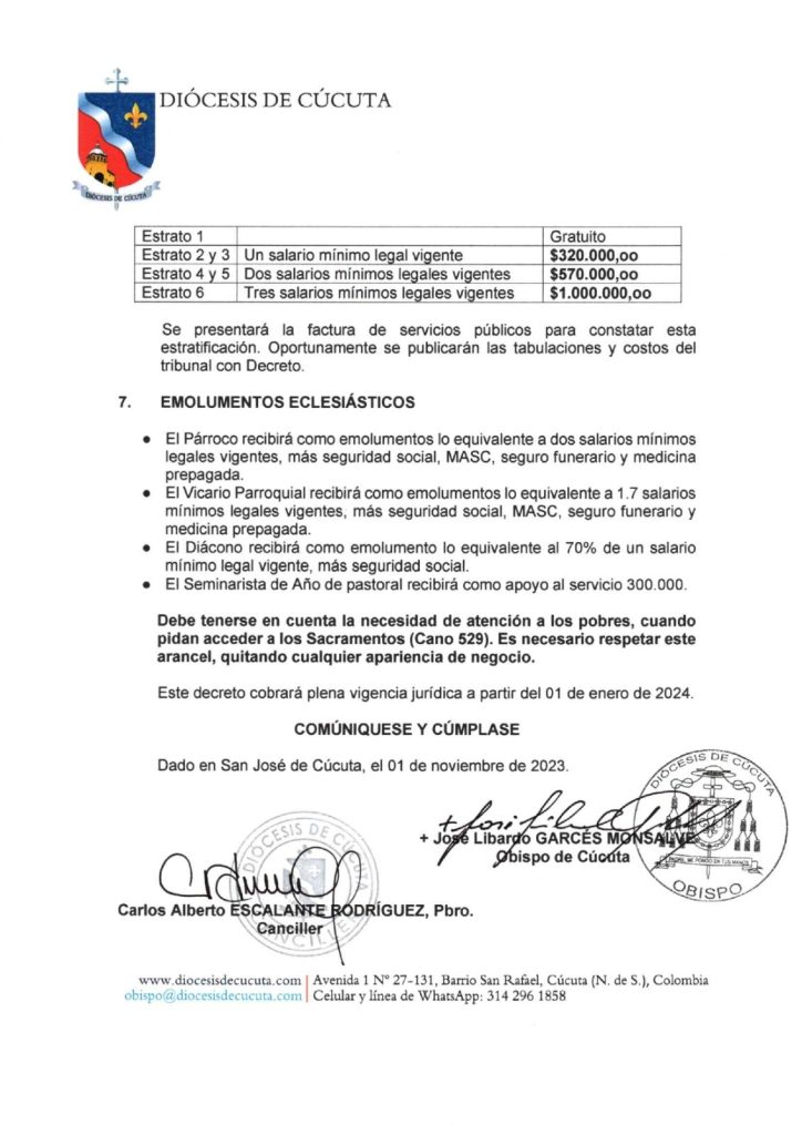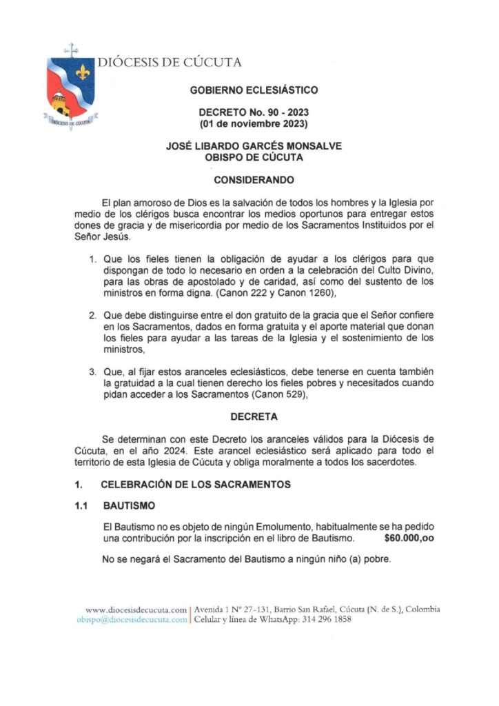 Monseñor José Libardo Garcés Monsalve, Obispo de la Diócesis de Cúcuta, por medio del Decreto N° 90 del 01 de noviembre de 2023, da a conocer los aranceles eclesiásticos para el año 2024 en esta Iglesia Particular.