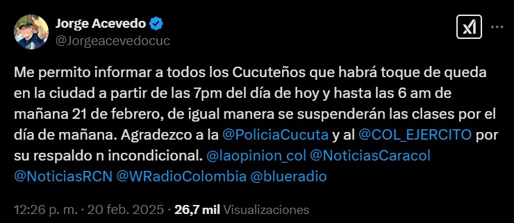 El alcalde de Cúcuta, Jorge Acevedo usó su cuenta de X (antes Twitter) para dar a conocer el toque de queda que se hará efectivo desde las 7:00 p.m. del día de hoy hasta las 6:00 a.m. del día de mañana, 21 de febrero.