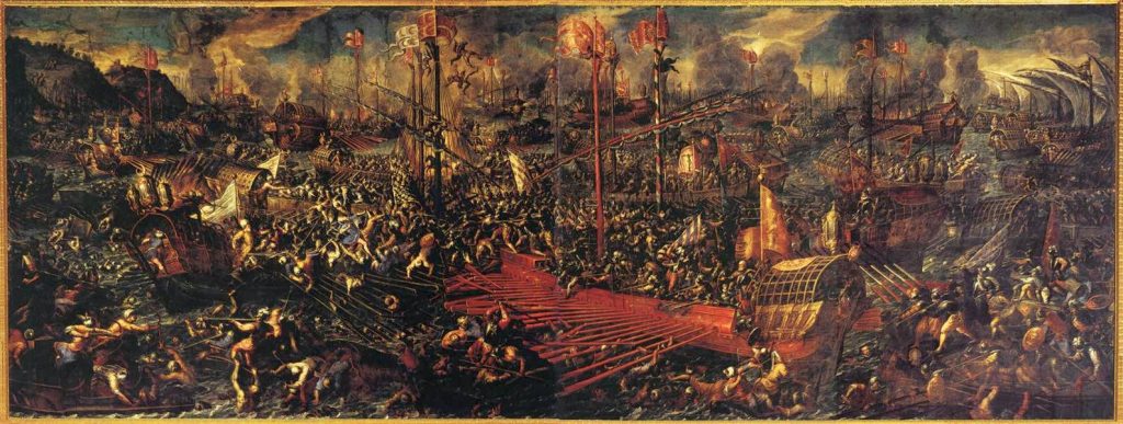 Cuenta la historia que el día antes de la batalla, los marineros, una coalición de estados católicos marítimos, promovida por el Papa V y el imperio Otomano, un imperio islámico que se había establecido en Estambul, en defensa y el cuidado del continente europeo, rezaron el Rosario a la Virgen, de rodillas. En este caso si hubiese ganado la flota otomana, el islam se hubiese expandido dentro del continente europeo.