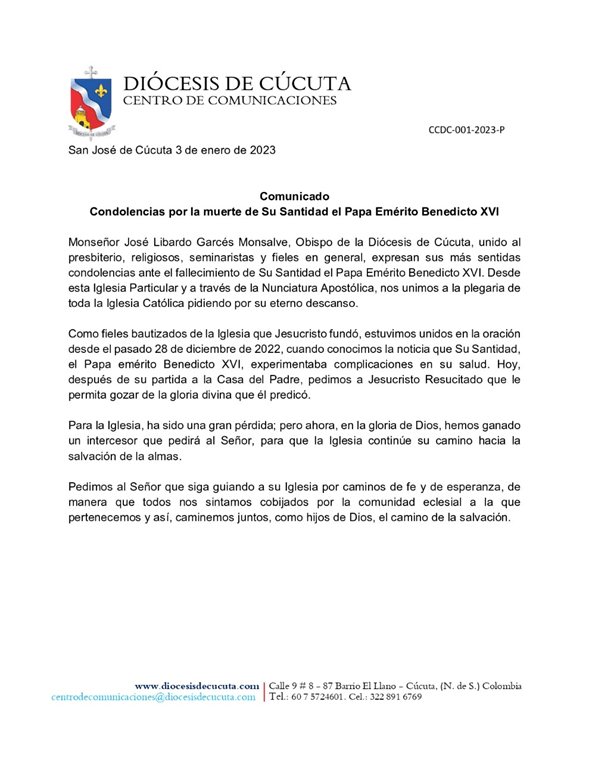 Por su parte, la Diócesis de Cúcuta se unió al dolor de la Iglesia Católica, al recibir la noticia del fallecimiento del Papa emérito Benedicto XVI, asimismo es consciente del gozo de Su Santidad en la presencia plena de Dios, por lo que, a través de un comunicado, expresó sus condolencias y pidió a los fieles bautizados orar por su eterno descanso y por la Iglesia a la que él sirvió. Esta misiva fue enviada a la Nunciatura Apostólica en Colombia, desde donde se hará llegar a la Santa Sede.