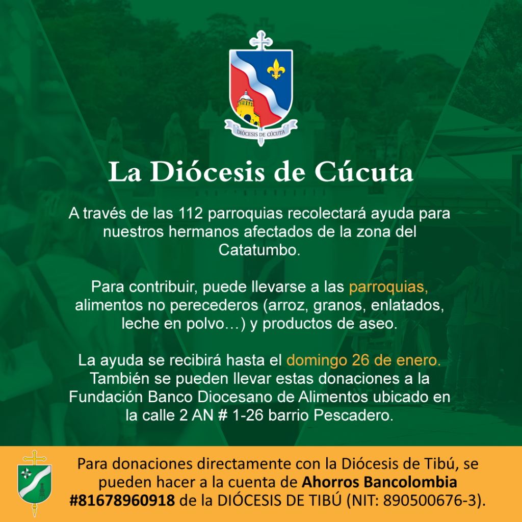 Por su parte, el sacerdote Aguilar, vicario general de Cúcuta, invitó a los fieles que se congregan en las 112 parroquias de esta Iglesia Particular a expresar su caridad mediante donaciones para las víctimas del conflicto. Esto, como un centro de acopio para quienes les resulta difícil acudir al Banco Diocesano de Alimentos.