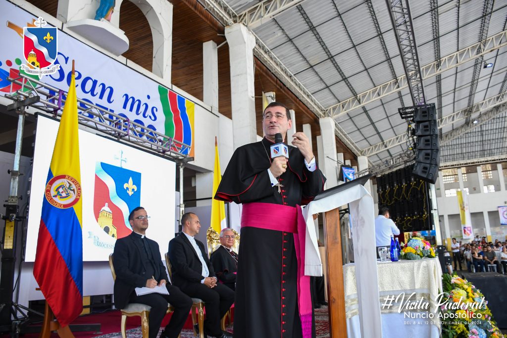 En el marco de la Visita Pastoral del Nuncio Apostólico, monseñor Paolo Rudelli, representante de Su Santidad el Papa Francisco, en Colombia, a la Diócesis de Cúcuta, inició su segundo día con la presencia que hizo en la Asamblea Diocesana 2024, en el coliseo del Colegio Salesiano. Este evento pastoral que comenzó a las 7:30 a.m., tenía como objetivo presentar el año pastoral 2025 y motivar a las delegaciones de todas las parroquias, a seguir caminando como discípulos del Señor. Monseñor José Libardo Garcés Monsalve, Obispo de la Diócesis de Cúcuta, dio apertura expresando la alegría de esta Iglesia Particular tras la visita de monseñor Paolo Rudelli, Nuncio Apostólico: “En presencia suya, reafirmamos, por tanto, nuestra profunda y sincera adhesión al sucesor del apóstol Pedro”, destacó monseñor José Libardo.